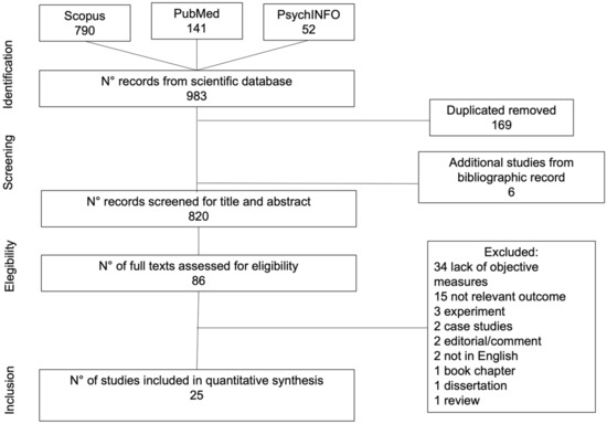 The Preferred Reporting Items for Systematic Reviews and Meta-Analyses (PRISMA) guidelines [28] was applied for reporting results of the present review. We queried PsychINFO, Scopus, and PubMed to search for the eligible studies. PsychINFO is considered the most used abstracts database of psychological sciences. Scopus is identified as a well-used electronic database of peer-reviewed research in several fields, such as medicine and life sciences. Instead, PubMed is considered to be an interface for searching MEDLINE, the most-used electronic database for health sciences.