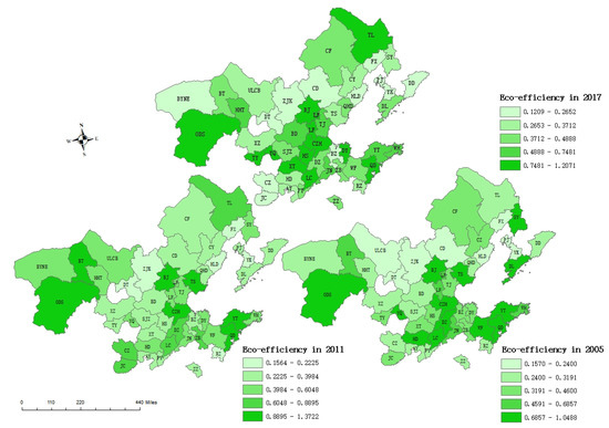 Distribution of eco-efficiency inside Bohai Rim in 2005, 2011, and 2017.
