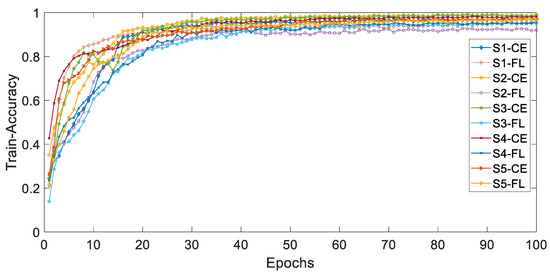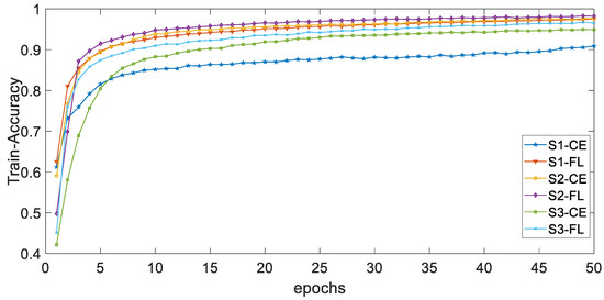 Figure 4 and Figure 5, respectively, show the curves of the accuracy of training and validation sets with epochs under different types of imbalances based on different loss functions. The adjustable focusing parameter γ is 2, and the balance weight α is 0.25. It can be seen from the curves of the two figures that, with the epochs getting larger, the overall trend of train-accuracy and val accuracy tends to 1. The convergence rate of the training set accuracy of HAR-CE is faster than that of HAR-FL. Except for S1, the convergence rate of the accuracy of HAR-CE with validation set is faster than that of HAR-FL.