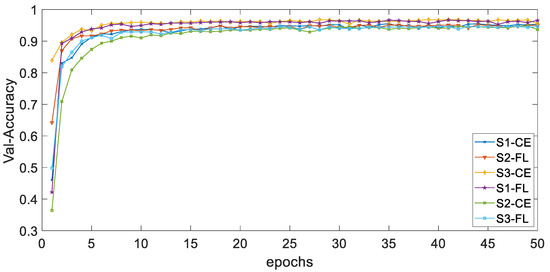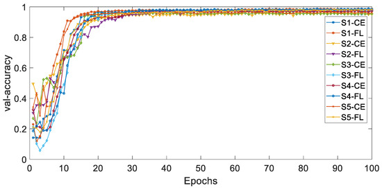 Figure 12 and Figure 13 respectively show the curves of the accuracy of training and validation sets with epochs under different classes numbers of distribution of dataset DH. The adjustable focusing parameter γ is 2, and the balance weight α is 0.25. It can be seen from the curves of the two figures that, with the increase of epochs, the overall trend of train-accuracy and val accuracy tends to a stable value. When epochs are in the range of 0–5, the convergence rate is fast; when epochs are in the range of 5–50, the convergence rate is slow and tends to be stable.