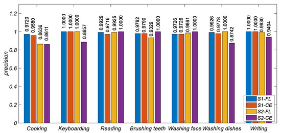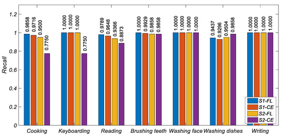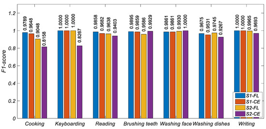 Figure 6, Figure 7 and Figure 8 show the histogram of the results of various metrics of HAR-CE and HAR-FL. It can be seen from the figure that the results of various metrics of HAR-FL of most classes are better than those of HAR-CE except for some classes. In the case of balanced S1, the difference between HAR-CE and HAR-FL is small. In the case of unbalanced S2, HAR-FL is significantly better than HAR-CE.