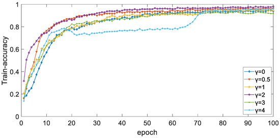 The curve of accuracy of training set with different epoch when parameter γ is different.