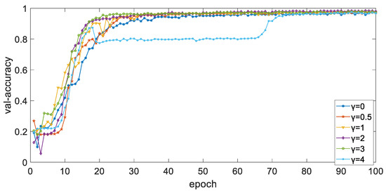 The curve of accuracy of validation set with different epoch when parameter γ is different.
