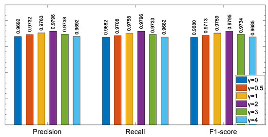 Precision, recall and the F1-score were used to evaluate the model performance under different values of γ. The experimental results are shown in Figure 11. It can be seen from the figure that when the parameter γ is 2, the model performance of each metric is significantly better than that when γ is other values.