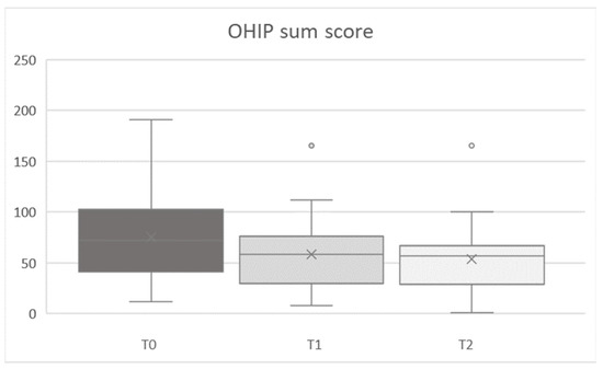 Total OHIP score at baseline (T0), first (T1) and second (T2) follow-up appointment.