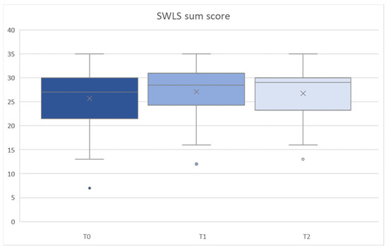 SWLS sum scores showed no significant main effect for time across T0/T1/T2 evaluations (all F [2,68] < 0.317, all p ≥ 0.153, partial-η2 [min to max] = 0.018 to 0.054) (Figure 2). However, mean scores showed a tendency to increase from T0 to T1/T2 (Table 4).