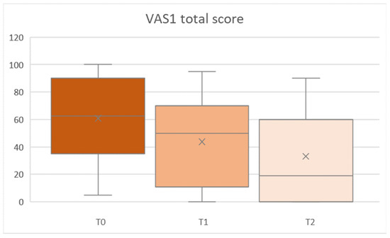 VAS1 values showed a significant main effect for time (T0, and T1/T2) in all parameters (Greenhouse–Geisser, all F [2,68] ≥ 7.845, all p ≤ 0.002, partial-η2 [min to max] = 0.187 to 0.288). VAS1 total score is demonstrated in Figure 3.