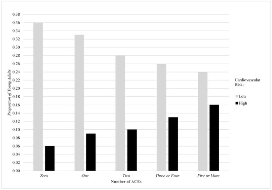 Proportion of young adults exhibiting low vs. high cardiovascular risk by number of ACEs.