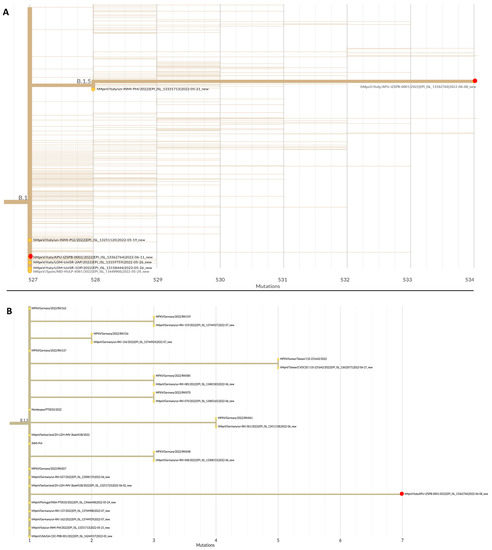 (A) Phylogenetic tree of the DNA sequences of samples from patients 1 and 2 in the Apulia region of Italy (red dots), and the sequences of representative Monkeypox genomes downloaded from the GISAID website (https://gisaid.org/, accessed on 17 August 2022); (B) phylogenetic tree of the DNA sequences of samples from patient 1 (red dot) and other sequences of representative Monkeypox genomes belonging to the same lineage of B.1.5. Accession numbers, the country of origin, and years are indicated. Phylogenetic analysis was performed using the Nextstrain web app (https://nextstrain.org/, accessed on 17 August 2022).