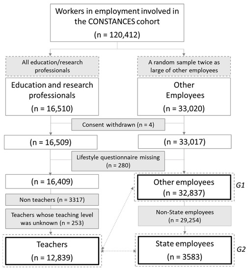 The present cross-sectional study is part of the ESTER study (Étude Santé-Travail dans l’Enseignement et la Recherche; “Occupational health study in education and research”), which has been specifically designed within the CONSTANCES [36] cohort to investigate the occupational risks and work-related health determinants of education and research professionals, particularly teachers. The CONSTANCES cohort is a large French population-based prospective study of more than 210,000 participants. Adults aged 18 to 69 at inception were randomly selected from the National Health Insurance Fund (CNAMTS: Caisse Nationale d’Assurance Maladie des Travailleurs Salariés), which covers salaried workers (“employees”), professionally active or retired, and their families. It, thus, reaches more than 80% of the French population of this age range, only excluding self-employed or agricultural workers (entrepreneurs, business owners, and agricultural occupations) and undocumented immigrants. The cohort was approved by the Institutional Review Board of the National Institute for Medical Research—INSERM (no. 01–011) and has obtained the authorization of the National Data Protection Authority (Commission Nationale de l’Informatique et des Libertés (CNIL, no. 910486)). During the inclusion phase (2012–2019), eligible individuals were selected from the national social security database, which includes all employees living in France, according to a random sampling scheme stratified by age, gender, socio-economic status (SES), and region of France. These persons received an invitation sent to their homes explaining the aim of the CONSTANCES project and how data privacy and security were ensured. There were no financial reward/incentives nor compensation for participation: participation was entirely voluntary. Those who volunteered (7.3% of those invited) provided informed consent and underwent an extensive medical examination in a health screening center. They also completed various questionnaires relating to their personal, environmental, behavioral, occupational, social, and medical factors. The participation (enrollment) rate was of the same order of magnitude as other similar cohorts, such as for the UK Biobank [36].