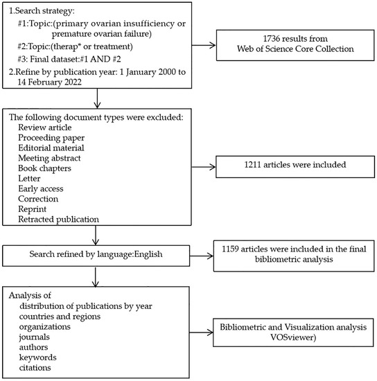 To perform a systematic analysis of the therapy for POI, we chose original articles and other types of documents (review article, proceeding paper, editorial material, meeting abstract, book chapters, letter, early access, correction, reprint, retracted publication) were not considered. The search strategy was as follows: TS = (primary ovarian insufficiency or premature ovarian failure) AND TS = (therap* or treatment). A total of 1159 documents from 1 January 2000 to 14 February 2022 were used for visualization analysis from the Web of Science Core Collection. The search and download of data were completed on 14 February 2022. Figure 1 presents the literature search and selection process.