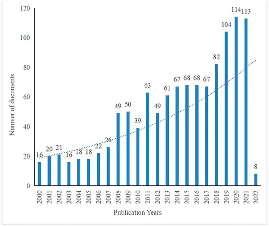 Distribution of publications by year on therapy for POI from 2000 to 2022. The bibliographic data were downloaded on 14 February 2022.