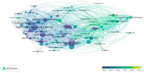 Organizations with citation relations shown as an overlay graph plotted with VOSviewer. The analysis method was Linlog/modularity. The weight was citations. The thickness of lines indicates the strength of the relationship. The color indicates the average published year.
