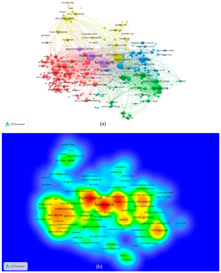 VOSviewer visualization map of most commonly cited journals related to therapy for POI. (a) Co-citation network of the most commonly cited journals. Of the 4802 cited journals, 331 met the threshold. (b) The density map of the most commonly cited journals. The big nodes represent journals with large numbers of citations.