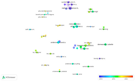 Overlay visualization of co-authorship analysis of authors. The analysis method was Linlog/modularity. The weight was citations. The thickness of the line indicates the strength of the relationship. The color of the circle represents the average published year.