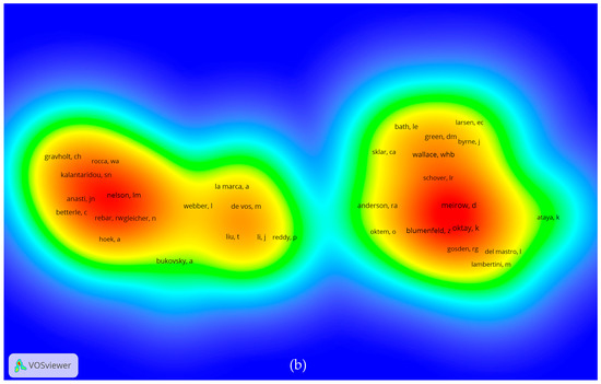 A co-citation (cited authors) visualization map was also generated using VOSviewer software [26]. The co-citation frequency of Meirow, D. and Oktay, K. was higher, it indicated that their academic relationship was closer and the “distance” was closer. Nelson, L.M. and Rebar, R.W. were another pair of authors with simultaneous high citations. Through the analysis of co-citation (cited authors), the core authors in the field of therapy for POI can be classified according to this “distance”. It can be seen that Meirow, D., Oktay, K., and Nelson, L.M. had made significant contributions to therapy for POI (Figure 6a,b).