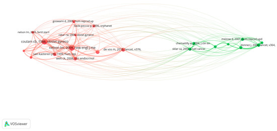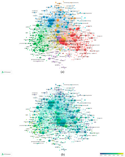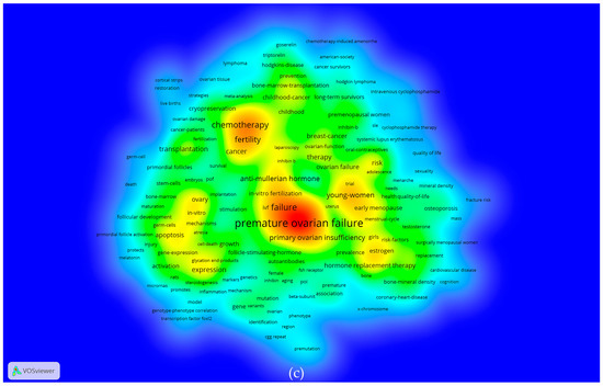 According to the density map of keywords (Figure 7c), “premature ovarian failure”, “failure”, “primary ovarian insufficiency”, “anti-mullerian hormone”, “chemotherapy”, “fertility”, and “young-women” had higher weight.