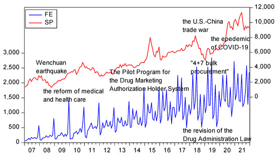 SP by considering monthly data from 2007:M1 to 2021:M12. In 2007, the scope of fiscal expenditure items had changed a lot, and the data of previous years cannot be compared, so we chose the monthly data starting from 2007. From the National Bureau of Statistics of China, we obtained data on medical and health fiscal expenditures. Then, we used Shanghai Stock Exchange Medical and Health Industry Index to represent the trend of stocks in the pharmaceutical industry. We transformed all raw data into natural logarithms to avoid potential heteroskedasticity and dimensional differences between series. The data are first-differenced to perform a bootstrap causality test. This period is a critical period for the rapid expansion of China’s pharmaceutical industry. It also covers important events such as China’s medical reform and drug reform, which is representative. In 2007, the investment in medical and health financial expenditure was CNY 198.996 billion, which will increase nearly ten-fold by 2019, reaching CNY 1.9205 billion. Jin [