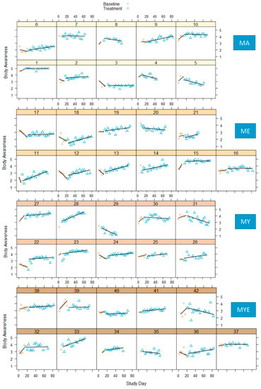 Body awareness scores in four conditions during baseline and treatment phases for each participant with regression lines for each phase. Note. MA = Mantra meditation only; ME = meditation and ethical education; MY = meditation and physical yoga; MYE = meditation, physical yoga, and ethical education.
