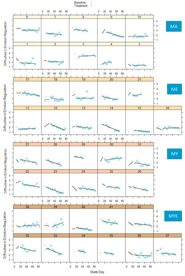 Difficulties in emotion regulation in four conditions during baseline and treatment phases for each participant with regression lines for each phase. Note. MA = Mantra meditation only; ME = meditation and ethical education; MY = meditation and physical yoga; MYE = meditation, physical yoga, and ethical education.