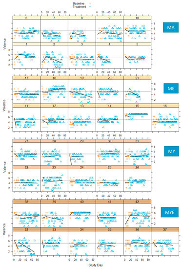 Valence scores in four conditions during baseline and treatment phases for each participant with regression lines for each phase. Note. Thin horizontal line represents a neutral valence (value = 5); MA = mantra meditation only; ME = meditation and ethical education; MY = meditation and physical yoga; MYE = meditation, physical yoga, and ethical education.