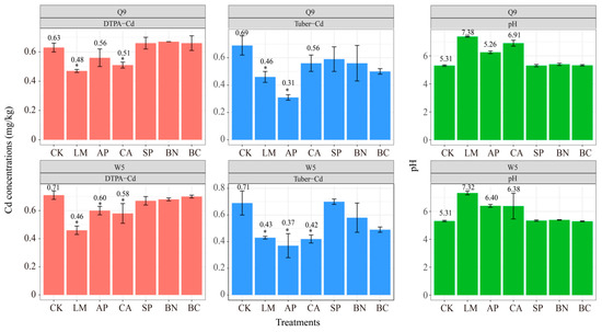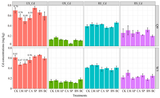 Effect of the morphology of Cd in Cd-contaminated soil after the application of different materials; Q9 and W5 represent the potato cultivar; EX-Cd, RE-Cd, OX-Cd, and RS-Cd represent exchangeable, reducible, oxidizable, and residual Cd, respectively; asterisks represent a significant difference from control (CK) (p < 0.05, ANOVA; pairwise-Tukey’s HSD). CK, Control; LM, Lime; CA, Calcite; AP, Apatite; SP, Sepiolite; BN, Bentonite; BC, Biochar.