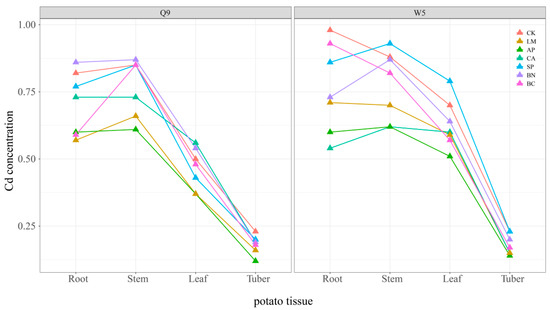 Another factor affecting the Cd concentration in potato tubers is the distribution of Cd among potato plants. Previous studies have provided convincing evidence that Cd is not transferred directly from the basal root to the xylem of the tuber, but takes a pathway involving the phloem [43,44]. Hence, Cd in potato tubers is more likely attributable to the partitioning of Cd within the plant than to the direct uptake of Cd from the soil by the potato pericarp [44]. We compared the differences in Cd concentrations in different tissues of potato after the application of passivated materials to assess the effect of passivated materials on Cd transport in potatoes (Figure 3). The results showed that the concentration of Cd in different potato tissues showed the trend of stem > leaf > tuber. However, Cd in the Q9 roots was more easily transported to the stem than in W5. Previous studies have shown that Cd in soil can be enriched to the aerial part through the potato root system and migrate in the xylem and phloem of the plant. In this process, potato stems may act as important ‘reservoirs’ and ‘hubs’ and may regulate the migration of Cd in various tissues of the potato. Subsequently, Cd in potato stems may be distributed to the leaves and migrate through the phloem to the potato tuber [43].