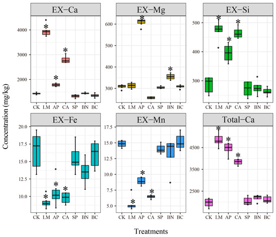 Effect of different treatments on the soil cations; Total-Ca, EX-Ca, EX-Mg, EX-Si, EX-Fe, and EX-Mn represent total concentrations of Ca and exchangeable Ca, Mg, Si, Fe, and Mn, respectively; asterisks represent a significant difference from control (CK) (p < 0.05; Kruskal–Wallisy; pairwise-wilocx).