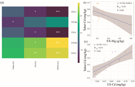 The correlation between the passivation effects and the soil cations. (a) The heatmap represents the correlation of parameters (Spearman correlation coefficient). The color difference represents the correlation coefficient and the asterisk indicates that the correlation is significant, “*” (p < 0.05), “**” (p < 0.01), “***” (p < 0.001); (b) The linear regression of EX-Mg versus Tuber-Cd. (c) The linear regression of EX-Cd versus Tuber-Cd.