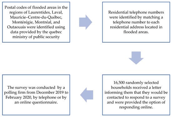 This investigation is rooted in the context of a larger mixed-method approach project led by an interdisciplinary and inter-university team joined through the Quebec Intersectorial Flood Network (RIISQ). This study is funded under the Québec government 2013–2020 Climate Change Action Plan. The quantitative section of the research consists of a population health survey undergone eight to ten months after the 2019 spring flood in Quebec across the six most affected socio-sanitary regions (Laurentides, Laval, Mauricie–Centre-du-Québec, Montérégie, Montréal, and Outaouais). The survey, conducted from December 2019 to February 2020, was carried out by telephone or by an online questionnaire under the supervision a professional survey firm.