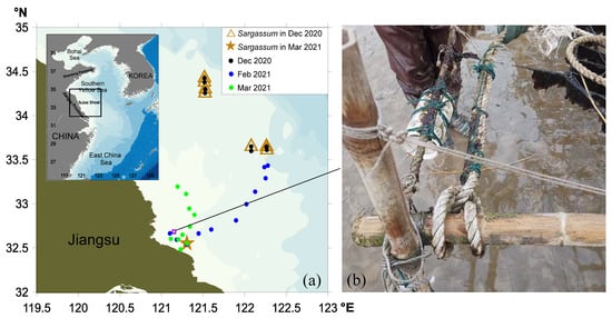 Cruise observation stations in Subei Shoal, Southern Yellow Sea, in December 2020 (indicated by black circles), February (blue circles), and March (green circles) in 2021. (a) The location of Sargassum, indicated by brown symbols, discovered in December 2020 (triangles) and March 2021 (star). The purple open square marks the location of the Neopyropia cultivation rafts (b).