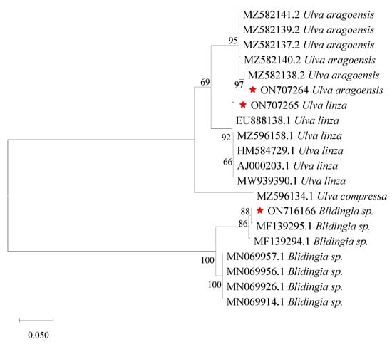 Genomic DNA was extracted from individual thallus using a modified CTAB method []. Then, all the specimens were identified by their ITS (internal transcribed spacer) sequences []. Morphological features of the samples were also analyzed to separate Ulva linza and U. prolifrea for the LPP (U. linza-procera-prolifera) clade [], which was further confirmed by the 5S rDNA spacer sequences []. To elucidate the relationship among the algae samoles, 17 ITS sequences from Ulva and Blidingia were downloaded from GenBank as references. Phylogenetic trees were built using Maximum Likelihood (ML) methods with MEGA (10.0). Bootstrap value of 500 was taken in the tree construction.