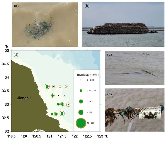 The floating biomass of Sargassum was relatively high (0.58 t km−2 on average) compared to that of green macroalgae (Figure 3d). These scattered patches (<1 m2) of Sargassum horneri could occasionally form strips at the surface, and they could be observed attached to the Neopyropia rafts (Figure 3e).