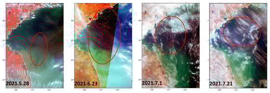Satellite images of floating green macroalgae in the Southern Yellow Sea from 28 May to 21 July 2021 (false-red-green-blue (RGB) composite of Ocean and Land Color Instrument (OLCI) images, R: band 17, G: band 6, B: band 3) (red circles indicate the main distribution area of floating biomass).