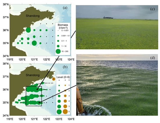 Distribution and biomass of floating Ulva (green circles) and Sargassum (brown circles) in the Southern Yellow Sea (SYS) in July 2021. (a) Floating biomass and distribution assessed by trawling; (b) biomass levels and distribution assessed by visual observation; (c,d) field images in the survey region.