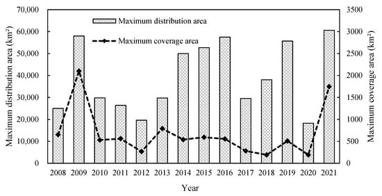 Maximum daily distribution area (bar graph) and maximum coverage area (dashed line) of Ulva prolifera green tides between 2008 and 2021 (data from The Bulletin of China Marine Disaster: 2009–2021 (MNR, 2009–2021)). Notes: Data based on satellite remote sensing (250 m and 50 m resolution). The distribution area is equal to the sum of the coverage area and the gap between the floating patches.