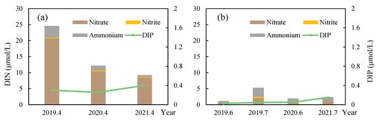 Average nutrient concentrations of Subei Shoal in April (a) and the Southern Yellow Sea in June and July (b) in 2019–2021. DIN: dissolved inorganic nitrogen (including nitrate, NO3−–N; nitrite, NO2−–N; and ammonium, NH4+–N); DIP: dissolved inorganic phosphorus.