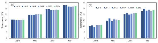 Monthly averaged sea surface temperature of Subei Shoal (a) and the Southern Yellow Sea (b) from April to July 2016–2021.