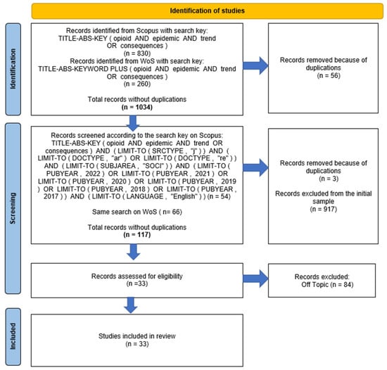 The first search string used concerned the words “Opioid” and “Epidemic” in addition to “Trend” and “Consequences”, searched in the Abstract, Title, and Keywords (Keywords Plus on Web of Science); this led to 830 documents results on Scopus and 260 on Web of Science. Fifty-six duplicates were found and removed, leading to 1034 total results. The research was then refined to include only articles, journals, and reviews in English, published between 2017 and 2022 in both datasets. The new analysis yielded 54 results on Scopus and 66 on Web of Science, leading to 117 total documents excluding duplicates. All the contributions were found, and all the abstracts were read and analyzed by two authors (HB and FD) to ensure eligibility. Thirty-three papers were eligible after analysis and focused on the topic under investigation. Figure 1 below summarizes the process of selection of the contributions to be included in the sample according to the PRISMA methodology [29,30]. The final sample concerned the articles listed in Table 1. The selected papers were coded and analyzed using the Nvivo software (version 12, QSR International, Doncaster, Australia).