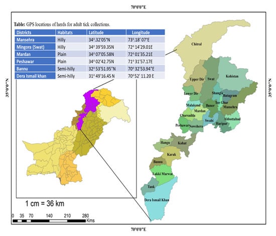Sheep and goat farming is an essential component of animal production systems in Pakistan and contributes significantly to the development of the livestock sector. Asian countries have the largest sheep and goat populations as it is 35.2% in India, 29.3% in China, and 12.0% in Pakistan []. Small ruminants play a vital role in poverty alleviation in resource-poor farming communities [,,]. In Pakistan, livestock production potential remains vibrant and signifies the foremost asset among resource-poor farmers []. Globally, hard ticks have an important role in decreasing the production potential in the livestock sector []. Ticks are extremely deleterious for livestock as they inflict a huge financial impact, especially in sub-tropical and tropical regions [,]. It has been estimated that USD 7.0 billion annual losses are attributed to hard tick infestations in small and large ruminants []. Rhipicephalus microplus has inflicted heavy economic losses (USD 22–30 billion) in the livestock sector [].