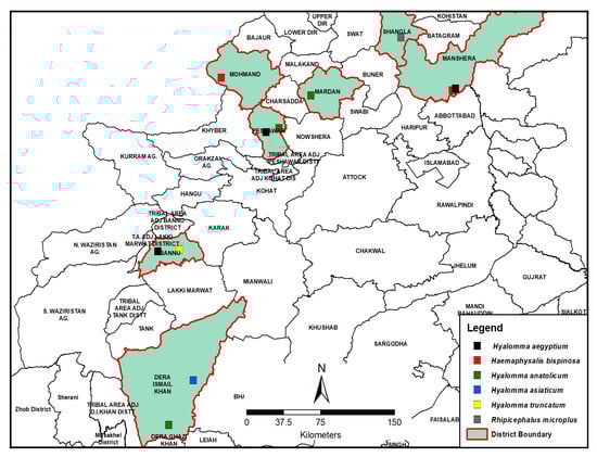 The livestock sector is a vital agro-economic component in Pakistan. Ticks also directly or indirectly cause substantial monetary losses in the livestock sector of Pakistan. Different tick species have been reported from various agro-climatic zones (ACZs) of Pakistan [,,]. Hyalomma anatolicum, Hyalomma marginatum, Hyalomma truncatum, Hyalomma dromedarii, Hyalomma rufipes, Rhipicephalus sanguineus, Rhipicephalus appendiculatus, Boophilus microplus, and Boophilus decolaratus tick species were recorded in different agroecological zones of Punjab [].