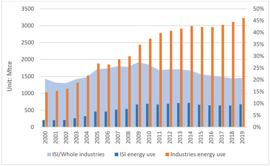 Energy use in China’s ISI and its proportion in whole industries. Source: China Statistical Yearbook, 2001–2020.