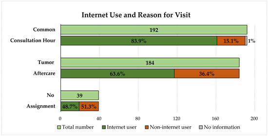 Visualization of the distribution of study participants regarding reason for visit and internet use. Internet users are colored in dark green, non-internet users in orange. Missing information regarding internet use is colored in grey. The bar in light green visualizes the number of patients in each patient group and equals 100% of the group. Thirty-nine patients did not provide their reason for visiting.