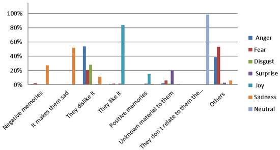 Other criteria to highlight the importance and adequate selection of the materials in the sport-oriented physical activities, are those which maximize the sensations that stimulate their sensory organs: sight, hearing, touch, proprioception, etc., distinguishing each of the resources based on the sensation they produced. In such a manner as to the reason that gave them to show each emotion, they have varied, depending on the manipulated material resource in each case, receiving the following results: those which provoked in them anger were not liked (53.93%); equally, those which provoked in them fear were not liked (20.39%); those which provoked disgust were rejected and considered repugnant (67.23%); those which surprised them provoked a sense of uncertainty as they did not know what to expect from them (73.44%); those which provoked happiness were liked and they were attracted to them (83.92%); and those that provoked sadness were rejected as they caused sorrow (11.06%). Therefore, the materials which were liked generally were those that provoked happiness (83.92%), whereas those that did not give any emotion to relate to resulted in indifference (98.92%), and those that were not liked produced anger and rejection (53.93%) (Figure 2).