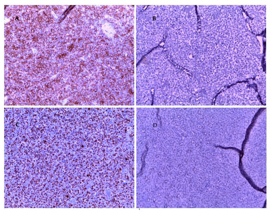 Immunohistochemistry of cervical mass biopsy, 20× magnification. (A): CD 20 positive. (B): CKAE1 AE3 negative. (C): high Ki 67. (D): SOX 10 neg.