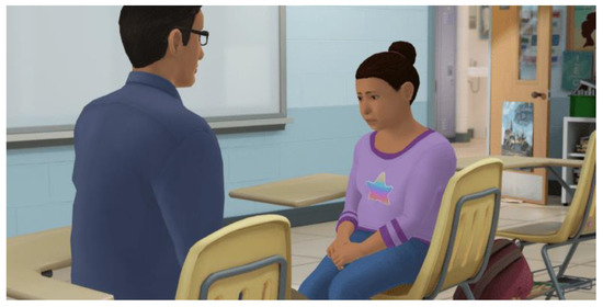 Resilient Together: Coping with Loss at School is a virtual role-play simulation developed by Kognito (www.kognito.com). This simulation follows a similar learning methodology to other virtual role-play simulations that have demonstrated to be effective in training educators and staff in communication techniques that produce attitudinal and behavioral changes. For example, elementary school educators who were trained via simulated role-play reported an average increase of 25% in feelings of preparedness to recognize students in psychological distress and approach their parents to discuss referrals to support [34]. In this same study, educators reported a 36% increase in the number of students recognized as being in distress, a 54% in number of students with whom they had discussions about concerns, and a 72% increase in the number of parents with whom they had discussions about referrals to support for their children. Additional studies demonstrate similar findings for training via virtual role-play simulators [35,36,37]. In the Resilient Together: Coping with Loss at School simulation, participants enter an online environment where they practice role-playing with emotionally responsive intelligent virtual students coded with memory, personality, and will respond like real students who have experienced a loss. The 40 min simulation involves participants practicing role-playing one of two conversations, dependent on their students’ grade levels, one is with a virtual student and the other with a virtual teacher. These virtual humans model behaviors that school personnel often see during a highly sensitive time such as after a student suicide in the school community. A virtual coach provides ongoing feedback on effective and ineffective communication strategies and though practicing the role-plays, participants learn how to support students impacted by a death and support their colleagues experiencing compassion fatigue. Several studies have demonstrated the efficacious impact of role-play simulations that have implemented similar learning models as the one examined in this study [34,35,36,37]. A more detailed description of simulation design and learning methodology can be found in Albright et al. [38] as well as an overview on simulations in PK-12 [39]. Figure 1 shows a screenshot of the simulated role-play.