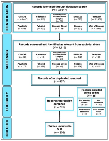 We adopted the PRISMA approach for conducting SLR [18]. We used 10 different databases (CINAHL, Cochrane, Communication and Mass Media Complete, EMBASE, ProQuest, PsychInfo, PubMed, Science Direct, Scopus, and Web of Science) to search for global peer-reviewed journal articles and gray literature published between 2009 and 2019. Searches were conducted with keywords related to social media (e.g., “social media”, “social networking site”, “Facebook”, “Twitter”) and alcohol (“alcohol”, “drink”). Records were identified through an initial database search (N = 23,647). Trained researchers examined each database list of articles and performed initial screening of the records to ensure that the studies retrieved focus on both alcohol use and social media use. Upon initial screening and assessment of the relevance, we identified a total of 1119 studies as a combined sample across the different databases. The removal of duplicates yielded a sample of 467 studies (see Figure 1). After this, we performed an initial coding of the full text of each article to determine its eligibility to include 291 studies. Eligibility was assessed by ensuring that the study focused on both alcohol use and social media use. In some cases, specifically in cases where big data sets of social media posts were used, the emphasis was on social media content that referenced alcohol. Thus, our inclusion/exclusion criteria was mainly focused on studies that (1) tested the relationship between social media use variables and alcohol use variables, (2) examined the phenomenon of social media use in association with alcohol consumption, and/or (3) studies that examined alcohol-related social media content, either as a standalone phenomenon or linked to other forms of data that built a connection between alcohol-related social media content and drinking patterns and prevalence among different populations. We then excluded 85 studies that were irrelevant to our search topics, such as alcohol studies using social media as a channel to recruit participants, errata/commentary, and interventions. This resulted in a total of 206 studies that were included in the analysis.