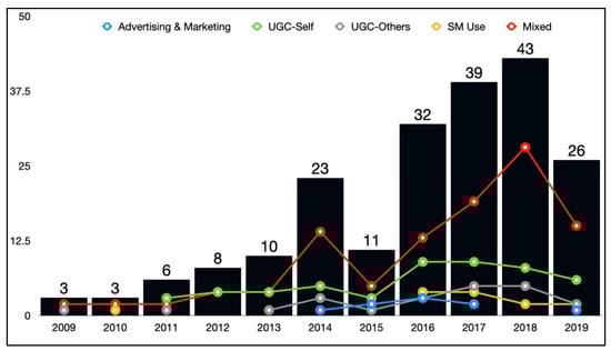 Our study also identified two types of UGC: self-generated and other-generated. Krumm, Davies, and Narayanaswami [22] define UGC as “content [that] comes from regular people who voluntarily contribute data, information, or media that then appears before others in a useful or entertaining way” on social media and other digital platforms. In the Curtis et al. [15] study, the authors operationalized UGC content on social by the inclusion of social media measures and constructs in the study (e.g., number of alcohol posts and density scores of alcohol images). Self-generated UGC refers to studies that focused on alcohol content created by participants themselves. Other-generated UGC refers to instances where participants in the study were exposed to UGC posts generated by others within their social media networks (e.g., a friend’s post). Thus, self-generated UGC deals with participants’ posting about alcohol, while other-generated UGC deals with exposure to posts by friends and acquaintances on social media platforms. It is worth mentioning, as noted later in the Findings section, that studies could potentially include different types of alcohol-related content, where the latter type also includes analysis of publicly available social media posts.