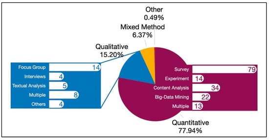 In terms of research methodology, the majority of the articles (n = 159, 77.94%) used quantitative methods, followed by 31 articles that used qualitative methods (15.20%), 13 articles that used mixed methods (6.37%), and 1 article (0.49%) that did not follow a particular research methodology, χ2(3) = 313.88, p < 0.001. For the studies that used quantitative methods (including those leveraging mixed-method approaches), 79 (48.77%) used survey methodology, followed by content analysis (n = 34, 20.99%), big-data mining (n = 22, 13.58%), experimental research (n = 14, 8.64%), and multiple quantitative methods (often surveys with content analysis or big data mining; n = 14, 8.02%), χ2(4) = 92.51, p < 0.001. Of the 35 studies that used qualitative methods, 14 used focus groups (40.00%), four used interviews (11.43%), five used textual analysis (14.29%), eight used multiple qualitative methods (22.86%), and four articles that used qualitative methods not listed in our coding scheme (11.43%), χ2(4) = 10.29, p = 0.04. Of the articles leveraging quantitative methodologies and mixed methodology, 71 used cross-sectional designs, while only 21 used longitudinal research designs, χ2(1) = 27.17, p < 0.001, thus indicating a much higher prevalence of cross-sectional than longitudinal designs (Figure 5).