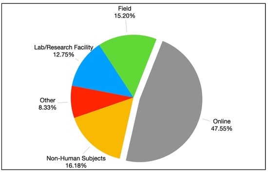 About half of the studies (n = 97, 47.55%) were conducted online, followed by non-human subjects (n = 33, 16.18%), field studies (n = 31, 15.20%), and studies conducted in a lab or research facility (n = 26, 12.75%). An additional 17 studies (8.33%) did not specify the context of the research, χ2(4) = 100.51, p < 0.001 (Figure 6).